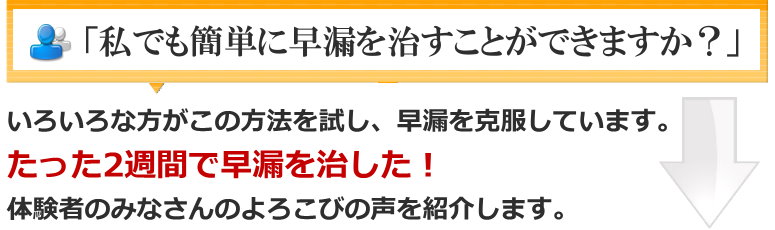 | 他の、一般に出回っている性関係の情報のほとんどが中途半端、あるいは難解、または間違った方法であることが、改めてよく分かりました。 私のように長年早漏をコンプレックスに感じてきた人間には、これ以上ないくらいのありがたい方法です。 感謝しています。 |